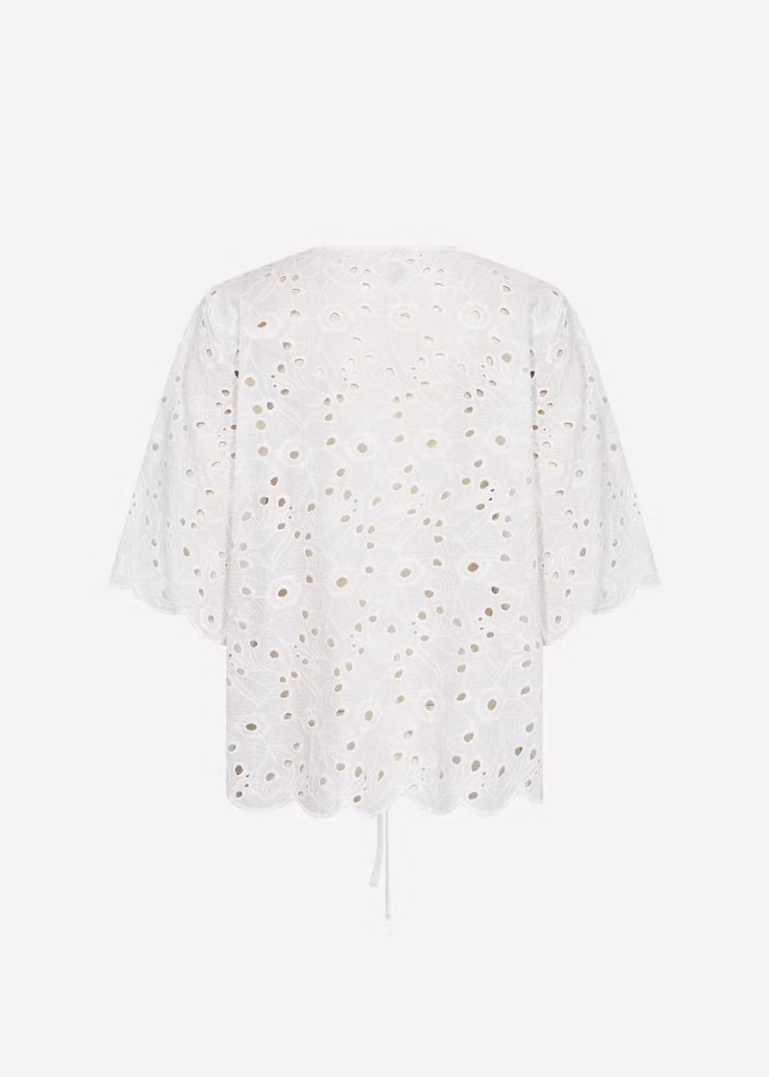 Sval och superfin blus tillverkad av 100% ekologisk bomull. Blusen har en lös passform, knytband framtill och ett vackert hålmönster.